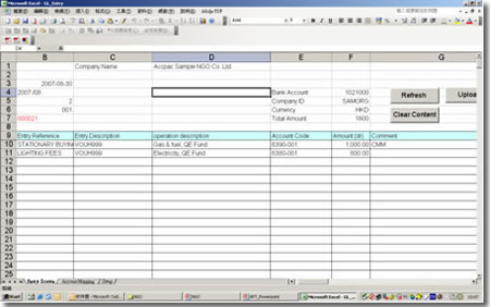 To reduce the cost for purchasing each accounting system in each services centre, the end user can enter daily expenses and income in the excel file. And then send back to file to headquarter. In headquarter, the end user can use the upload function to upload the record in the ACCPAC system.